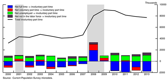 Despite substantial improvement in the unemployment rate and several other labor market indicators, the number of Americans involuntarily working part time (also called “part-time for economic reasons”) remains unusually high nearly five years into the recovery. The high level of involuntary part-time work has led to a concern that there is an underbelly of labor market slack not well accounted for by the overall unemployment rate. Our analysis suggests there are reasons to believe that continued cyclical improvement in the labor market will put downward pressure on involuntary part-time work, but there is also a possibility that secular trends may augur structurally higher part-time employment.